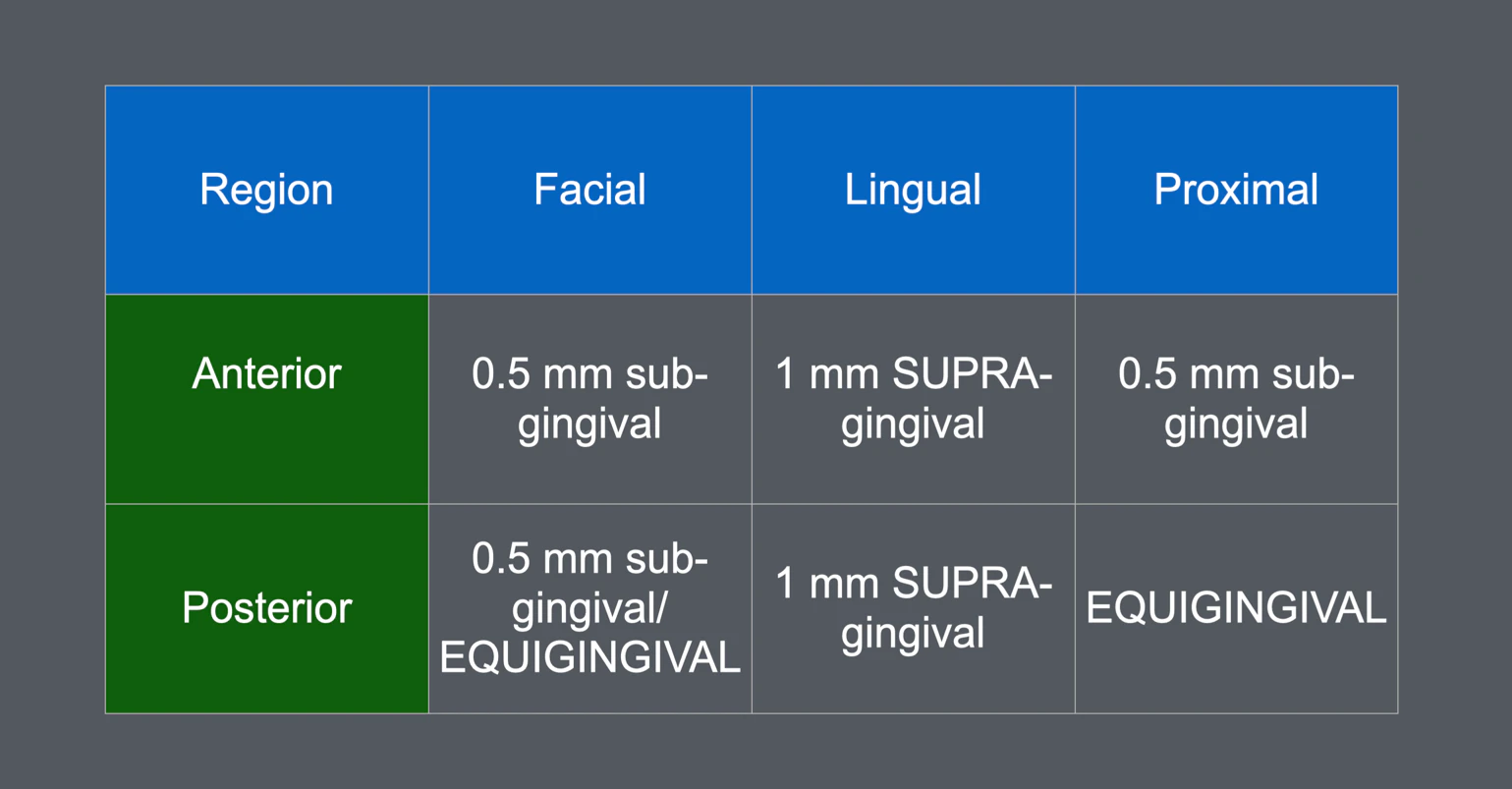 This can result in catastrophic problems due excessive residual cement going deep down in the peri-implant sulcus, being impossible to clean up and result in cement induced peri-implantitis. Lack of proper specification on the dental laboratory prescription (considered a legal record of medicine) can also result in medical-legal consequences. In the table below, is the suggested depth to be specified on your lab prescription. In non-esthetic regions (palatal/lingual surfaces, posterior proximal surfaces) it is best to have the margin either supra-gingival or equigingival for easy clean-up of cement. In the esthetic region, the margin depth should be no more than 0.5mm subgingival or else the residual cement clean up will become very difficult without traumatizing the delicate peri-implant soft tissues in the esthetic region.